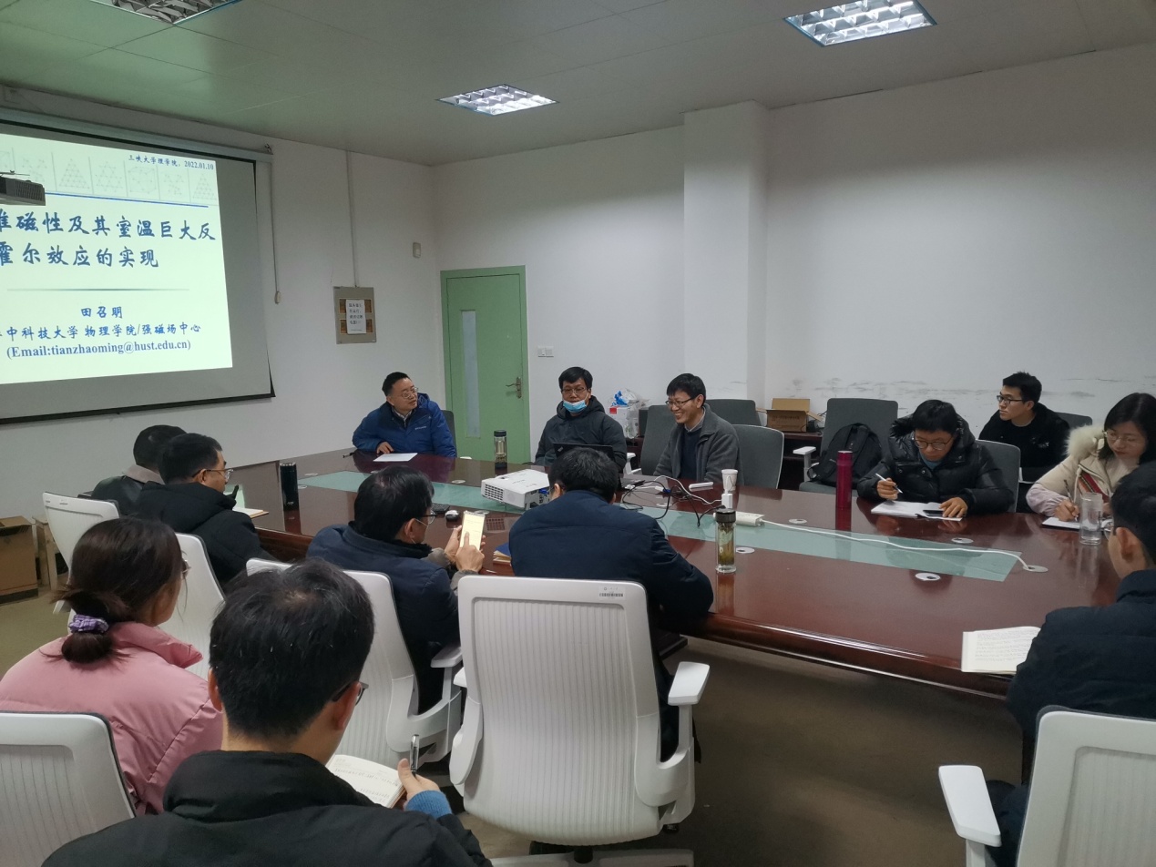 (通讯员 刘敏/图 许云丽)1月10日,华中科技大学物理学院田昭明教授应邀为磁电子所师生做题为“二维层状磁性材料中室温巨大反常霍尔效应的实现”的学术报告。报告会在理科楼L1605室召开,由磁电子所潘礼庆教授主持,磁电子所全体师生参加了本次报告会。
