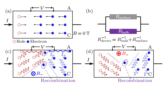 非磁性半导体材料及其器件在室温低静态磁场环境中通常容易呈现出较大的正磁阻效应,因此受到广泛的关注;然而如何获得大的室温负磁电阻效应仍有待研究。本文通过设计具有同侧金属探测电极的Au/n-Ge:Sb/Au器件,在50T脉冲强磁场特定的方向条件下,观察到了明显的室温负磁电阻效应,该效应很难在静态低磁场环境中观察到。通过结合霍尔效应实验测量结果和双极输运理论,分析认为这种异常负磁电阻效应主要与脉冲强磁场提供的极强洛伦兹力调制下器件表面电荷积累有关。通过调控器件的几何尺寸,本文进一步印证了该理论分析模型。本文研究成果为在脉冲强磁场环境中运行的基于非磁性半导体的新型磁传感、磁逻辑等器件的发展提供了新思路。