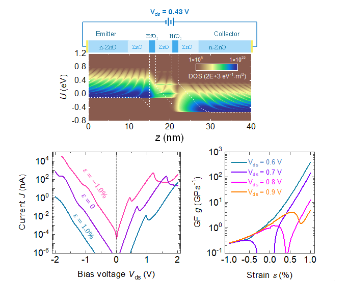 近年来,随着物联网、生物传感技术和人工智能等领域的快速发展,对于监测和感知环境机械形变与振动的高速、高频、低功耗、高灵敏度以及多功能应力传感器的需求日益增加。共振隧道二极管(Resonant Tunneling Diode,RTD)因其超快隧穿输运过程、独特的负微分电阻以及低隧穿电流等特性,成为一种具有潜力的候选器件。目前,RTD应变传感器主要基于GaAs异质结和石墨烯等材料,需要借助压阻效应来实现传感功能。与压电效应相比,压阻效应是一种纯机械调控手段,缺乏电极化调控因素,导致RTD的应力灵敏度因子(Stress Gauge Factor,GF)较低。为改善RTD的灵敏度,研究者们为此做出了许多的努力,例如改变材料晶向、温度、应力方向或优化衬底等,虽取得了一定进展,但目前报道的GF值仍普遍低于10 GPa-1,难以满足高灵敏度传感应用的需求。