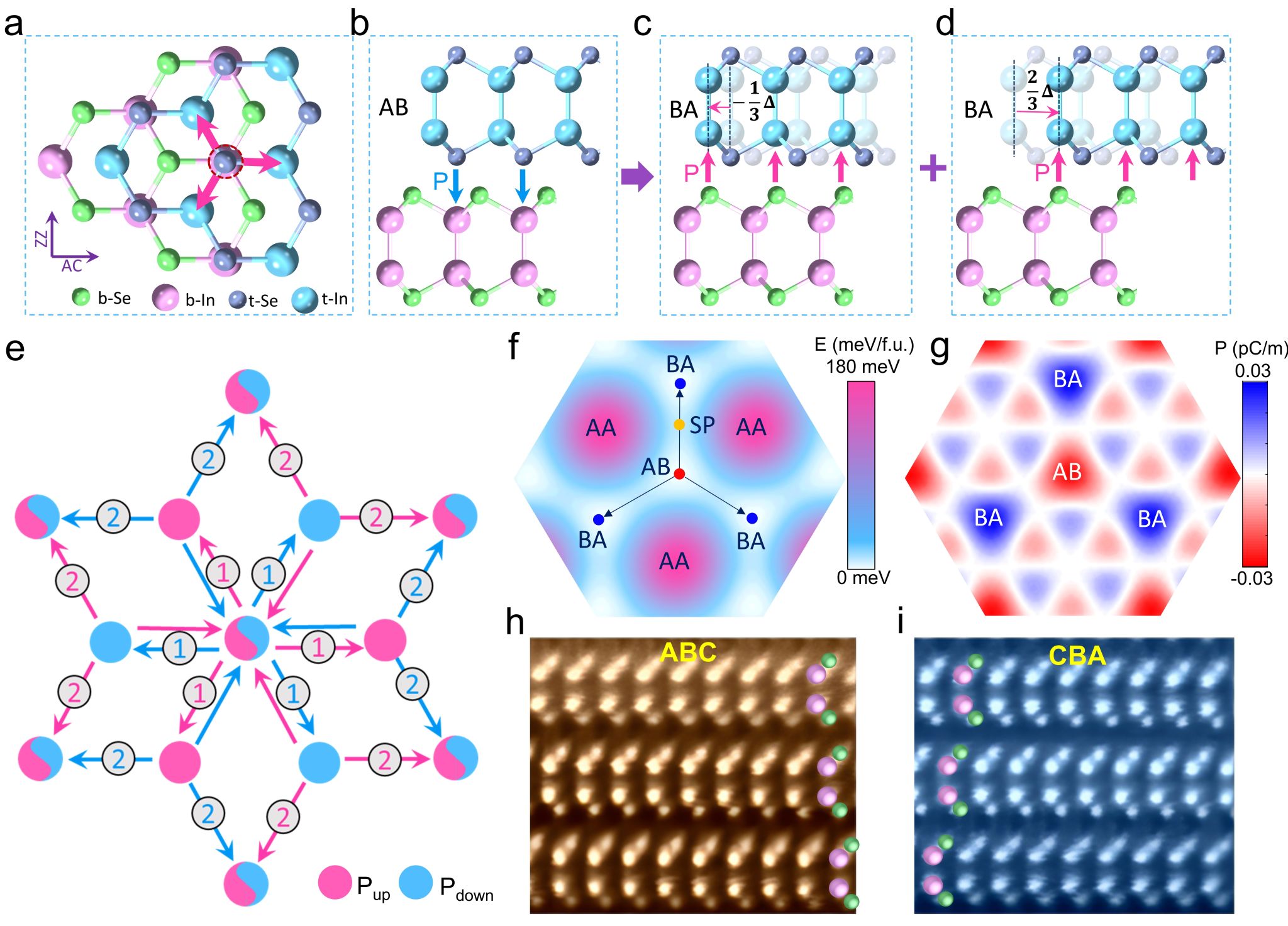 图1展示的菱面体堆叠的 InSe 的多向层间滑动。a) 双层γ-InSe的俯视图,显示了从 InSe 顶层到底层的三个滑动方向。b) 双层γ-InSe沿AC方向的侧视图。c) 双层γ-InSe 在向左滑动后极化发生转变的侧视图。d) 双层γ-InSe在向右滑动后极化发生转变的侧视图。e) 双层γ-InSe所有滑动方向的总结,包括第一次和第二次滑动过程,用圆圈数字表示。粉色和蓝色分别代表向上和向下的极化。f) 具有全堆叠构型的双层γ-InSe的计算能量图,显示 AB 和 BA 堆叠构型能量最低。通过沿着鞍点(SP)滑动可以切换两种极化状态。g) 所有堆叠构型的计算极化图。h) HAADF-STEM图像,显示了具有向下极化的γ-InSe三层结构。i) 具有向上极化的γ-InSe三层结构的原子图像。