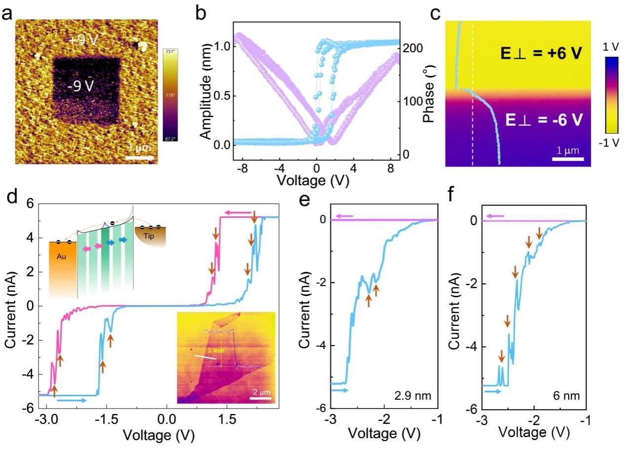 图 2展示了具有多态性的γ-InSe滑移铁电性。a) 用Dart-PFM以写畴模式(±9 V)对 23 纳米厚的γ-InSe薄片进行相位映射,清楚地显示出可切换的铁电OOP相位。b) PFM的外场相位和振幅磁滞回线有两个循环。c) 在 ±6 V 电场下对 10 纳米厚的 γ-InSe薄片进行的 KPFM 映射。沿白色虚线的 KPFM 振幅(蓝线)图示于插图中。d) 通过C-AFM测量得到的 3.9 纳米厚的 InSe 薄片的I-V曲线,具有明显的磁滞和多次电流跳跃。AFM图像和厚度显示在底部插图中,能带排列显示在顶部插图中。e) 2.9 纳米厚的InSe薄片的 I-V曲线,显示出较少的电流跳跃。f) 6 纳米厚的InSe薄片的I-V曲线,显示出更多的电流跳跃,表明根据层数的不同存在多态性。