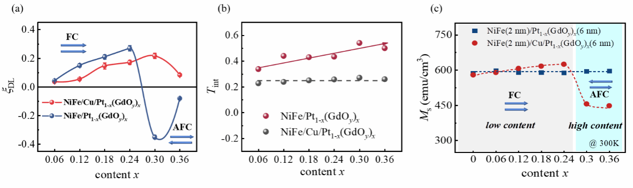 图2 (a) NiFe/Cu/Pt1-x(GdOy)x和NiFe/Pt1-x(GdOy)x的类阻尼力矩效率ξDL; (b) NiFe/Cu/Pt1-x(GdOy)x和NiFe/Pt1-x(GdOy)x的自旋透明度Tint; (c) 不同掺杂浓度x的 NiFe(2 nm)/Pt1-x(GdOy)x(6 nm)和NiFe(2 nm)/Cu/Pt1-x(GdOy)x(6 nm)样品的饱和磁化强度。