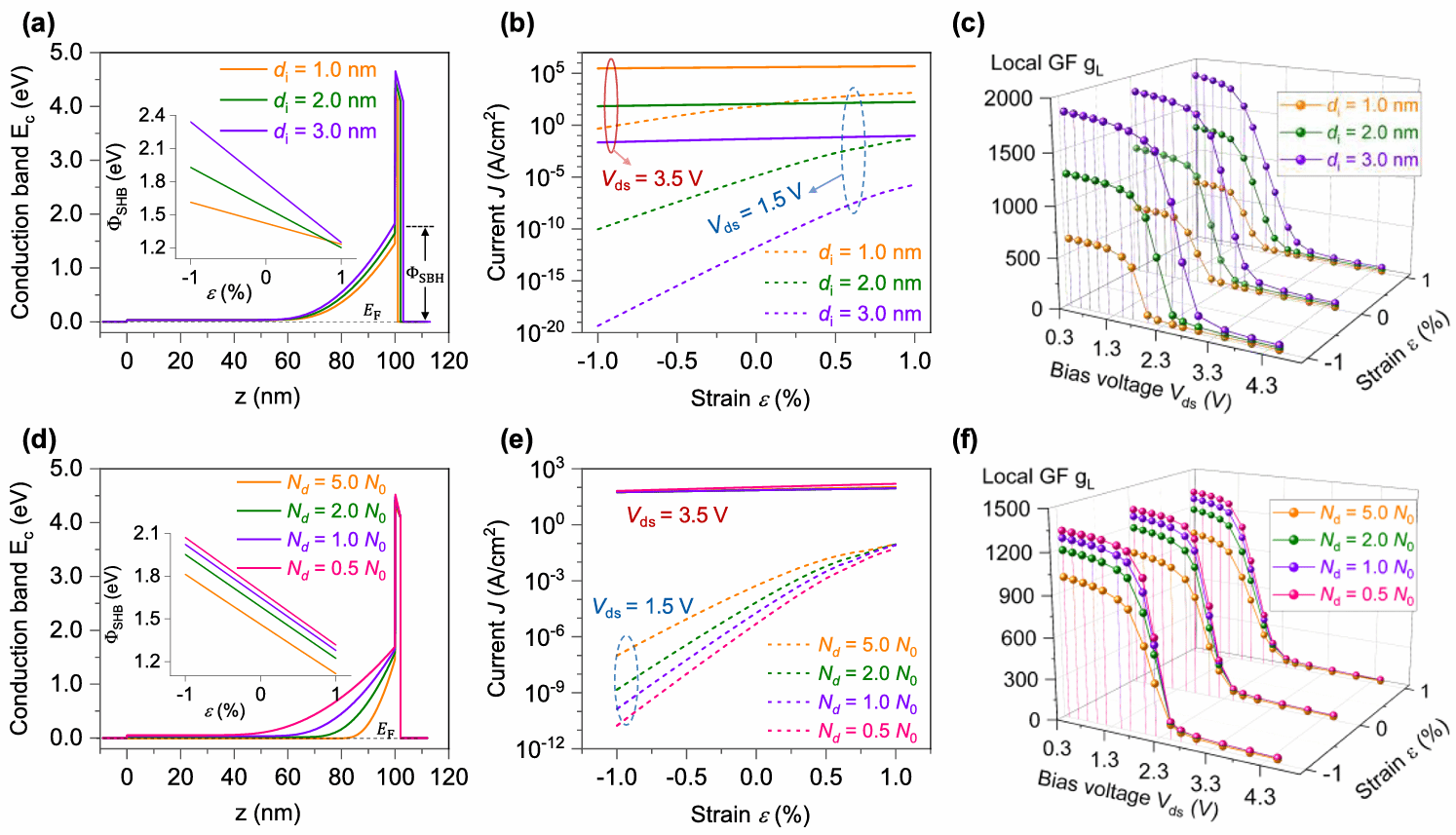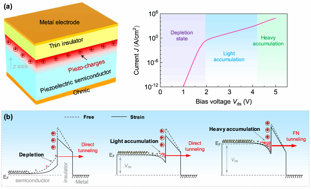 压电电子学传感器已成为机器人技术、人机交互和无线监测等应用中不可或缺的一部分。然而,尽管压电电子学传感器具备出色的传感性能,其灵敏度长期面临着可调且可靠性较差的问题,阻碍了它们在多功能方面的应用。本研究通过压电电子学和隧穿效应的耦合,聚焦于金属-绝缘体-半导体(Metal-Insulator-Semiconductor,MIS)隧道结,利用半导体器件物理COMSOL模拟仿真,设计出一种高度可电控灵敏度且稳定性极好的应变传感器。