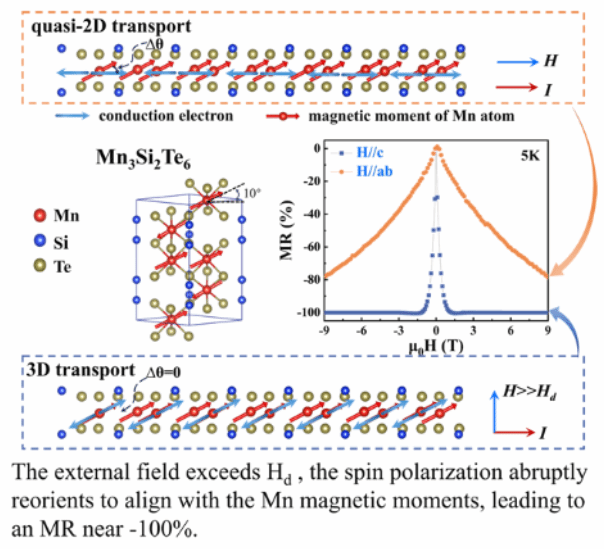 (通讯员:刘敏)近日,国际顶级期刊《Advanced Science》(中科院一区TOP期刊,最新影响因子14.1)上在线发表了三峡大学湖北省弱磁探测工程技术研究中心为第一署名单位的题为“Mechanism of Anomalous Anisotropic Colossal Magnetoresistance in Quasi-2D Mn3Si2Te6 Bulk Single Crystal”最新重要研究成果(论文链接:https://doi.org/10.1002/advs.202514651)。李世琦(在读研究生)、何雄老师和李帅老师为该论文共同第一作者,许云丽副教授、John Q. Xiao教授和潘礼庆教授为论文共同通讯作者,张文昊(在读研究生)、中心易立志副教授,鲁广铎副教授参与了相关工作,华中科技大学国家脉冲强磁场科学中心李天一博士和夏正才教授为该工作的顺利推进提供了重要支持。