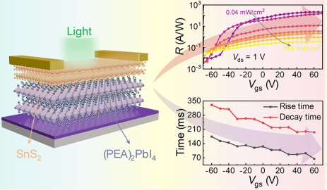 研究二:光探测器在光电集成电路及工业/生物传感、成像与光通信等领域具有重要应用,二维半导体SnS₂是一类典型的光电材料,具有强光响应与栅控能力,但其本征“开态”暗电流偏高,限制了灵敏度提升与低功耗应用,并且传统器件普遍受“响应度—速度”权衡瓶颈制约。本研究采用全干法转移构筑二维R−P钙钛矿(PEA)₂PbI₄/SnS₂范德华异质结光晶体管,通过(PEA)₂PbI₄对界面进行调控与钝化,实现暗电流约两数量级抑制,并在栅压调制下获得高响应度(最高218 A/W)、高探测率与超高EQE,同时实现“栅压越高、响应更快且响应度也更高”的反常协同,从而打破传统响应度—速度权衡。该策略兼顾低暗电流、低功耗与长期环境稳定性(空气中存储4000 h暗电流漂移极小),并为二维钙钛矿/二维硫族化物异质结构器件提供了可编程的界面/能带工程思路,推动高性能、稳定的二维光电器件与集成应用。